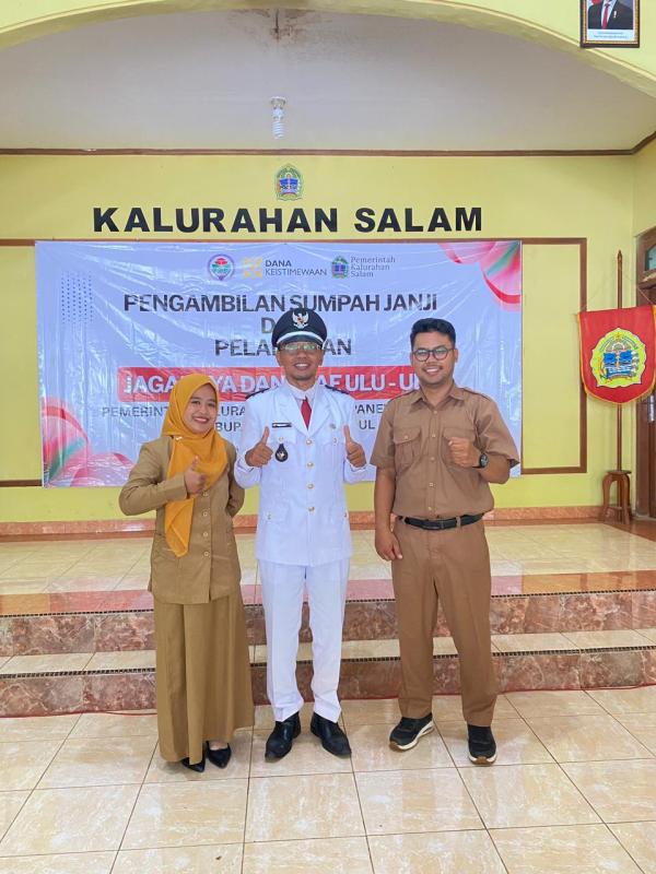 Pada hari Senin tanggal dua puluh tujuh bulan April tahun dua ribu dua puluh enam bertempat di Balai Kalurahan Salam ASMUNI, Lurah Salam Kapanewon Patuk, berdasarkan Keputusan Lurah Salam Kapanewon Patuk Nomor 13 Tahun 2026 tanggal 24 April 2026, dengan disaksikan oleh 2 (dua) orang saksi yaitu SLAMET PARYADI, Ketua Badan Permusyawaratan Kalurahan Salam, dan WARDAYA, Ketua LPMK Salam, telah mengambil sumpah jabatan saudara ISNAN NAHARI FALAKH sebagai Jagabaya Kalurahan Salam dan NOVITA GINTRI MEGA UTAMI sebagai staf ulu-ulu Kalurahan Salam Kapanewon Patuk Kabupaten Gunungkidul.